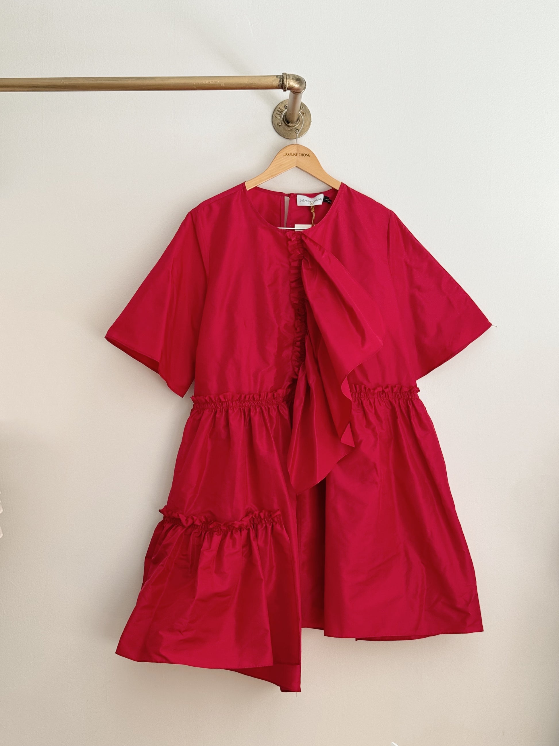 The Farfalle Babydoll Dress is a bold trapeze-cut dress in rich silk taffeta. A gathered silk panel on the bodice can be worn as a sculptural detail or a romantic cascading neckline. Raw edge ruffled seams, a dance-everywhere dressed up/down silhouette, finished with a delicate front pocket for stashing after-dinner mints. Loose billowing fit. Keyhole back closure.