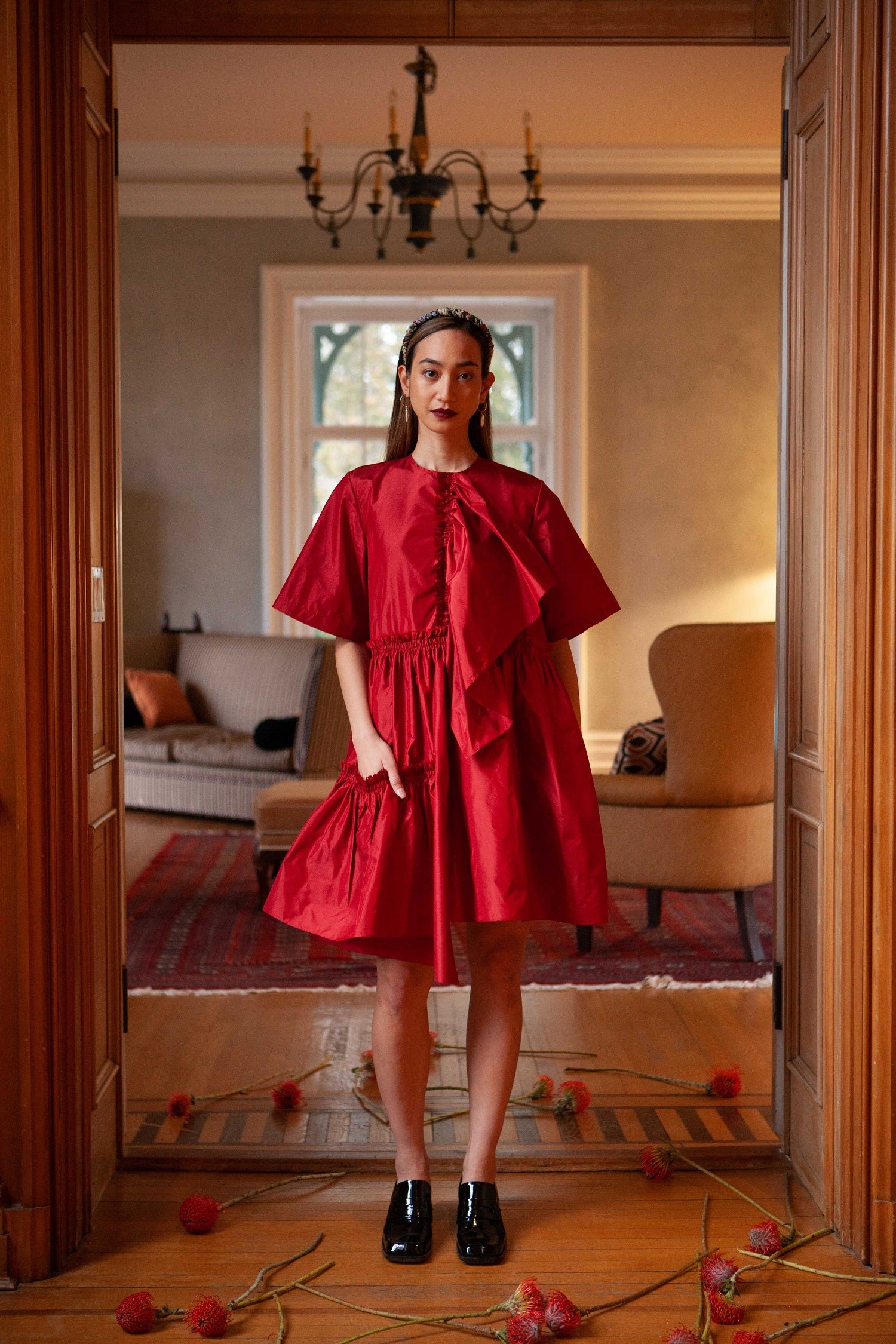 Available in Crimson and Black. Silk taffeta. Made in New York's Garment District by a small team of dedicated seamstresses.