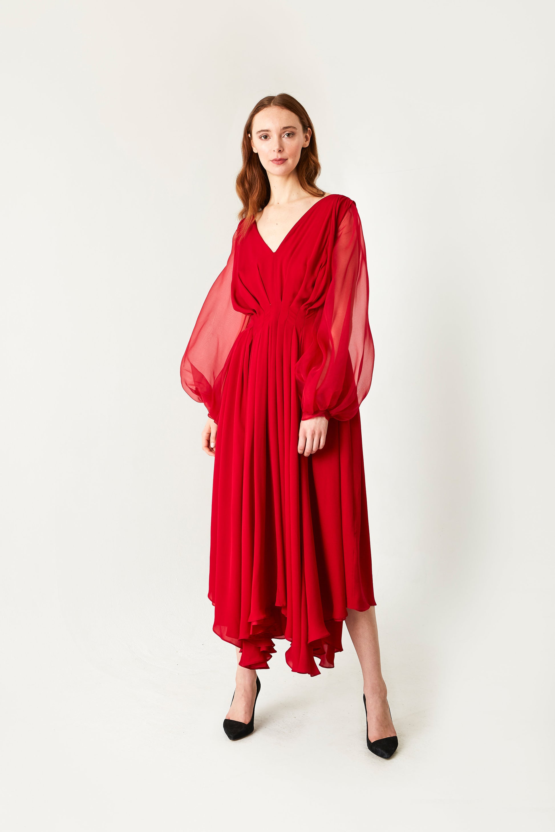 Fluidly draped and meticulously crafted, the Mara Silk Dress from Jasmine Chong is the height of romance. A conscientiously designed pleated bodice gives way to a flared dramatic skirt with an asymmetrical hem. Balloon voluminous sleeves made of silk organza complete this piece.