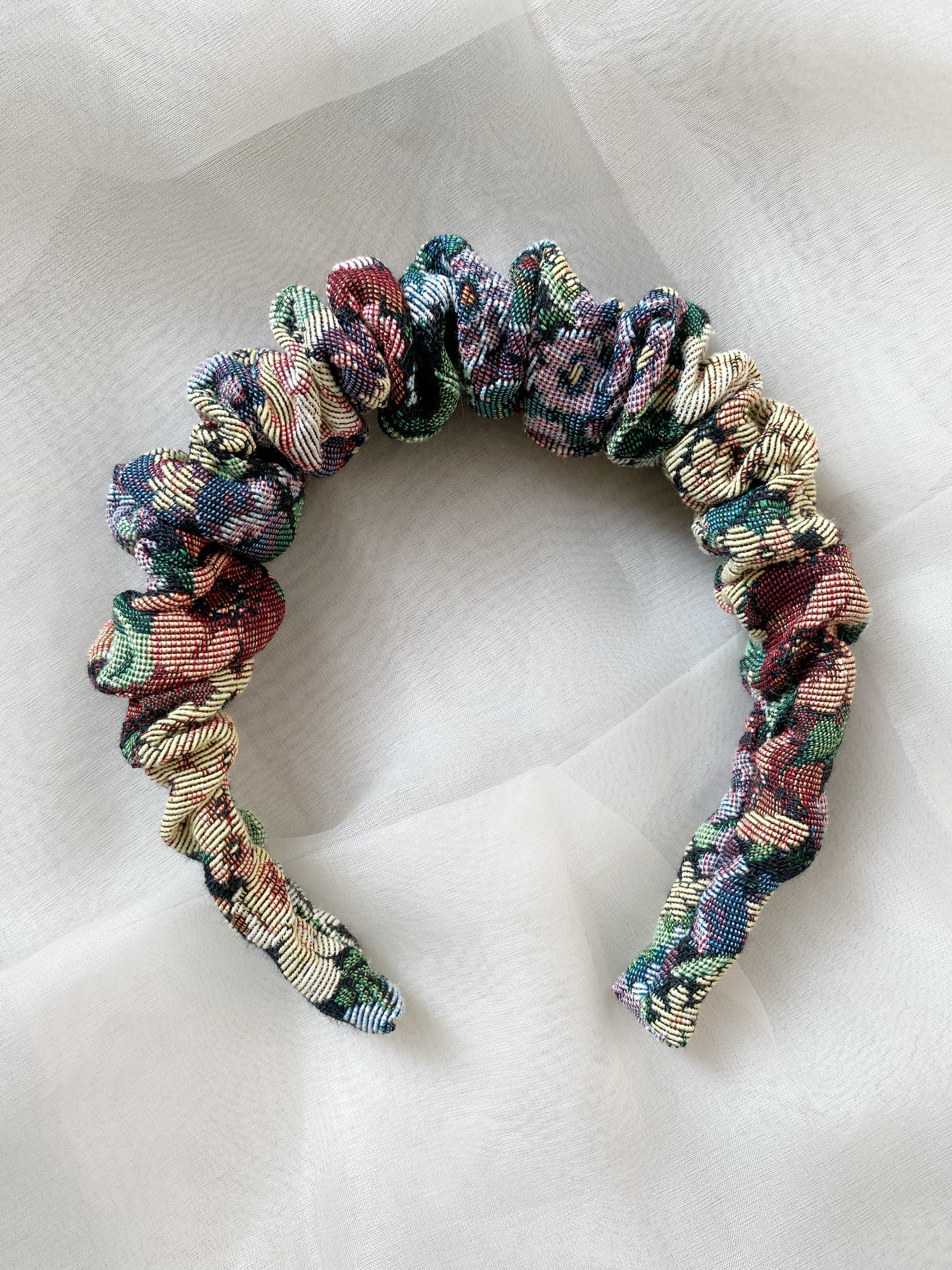 Sculptural and sweet at the same time, the Sugar Gathered headband is cut out of the finest fabrics du jour in the atelier, plush velvets, Italian tapestry, supple silk charmeuse. Gently gathered for subtle, sophisticated charm.