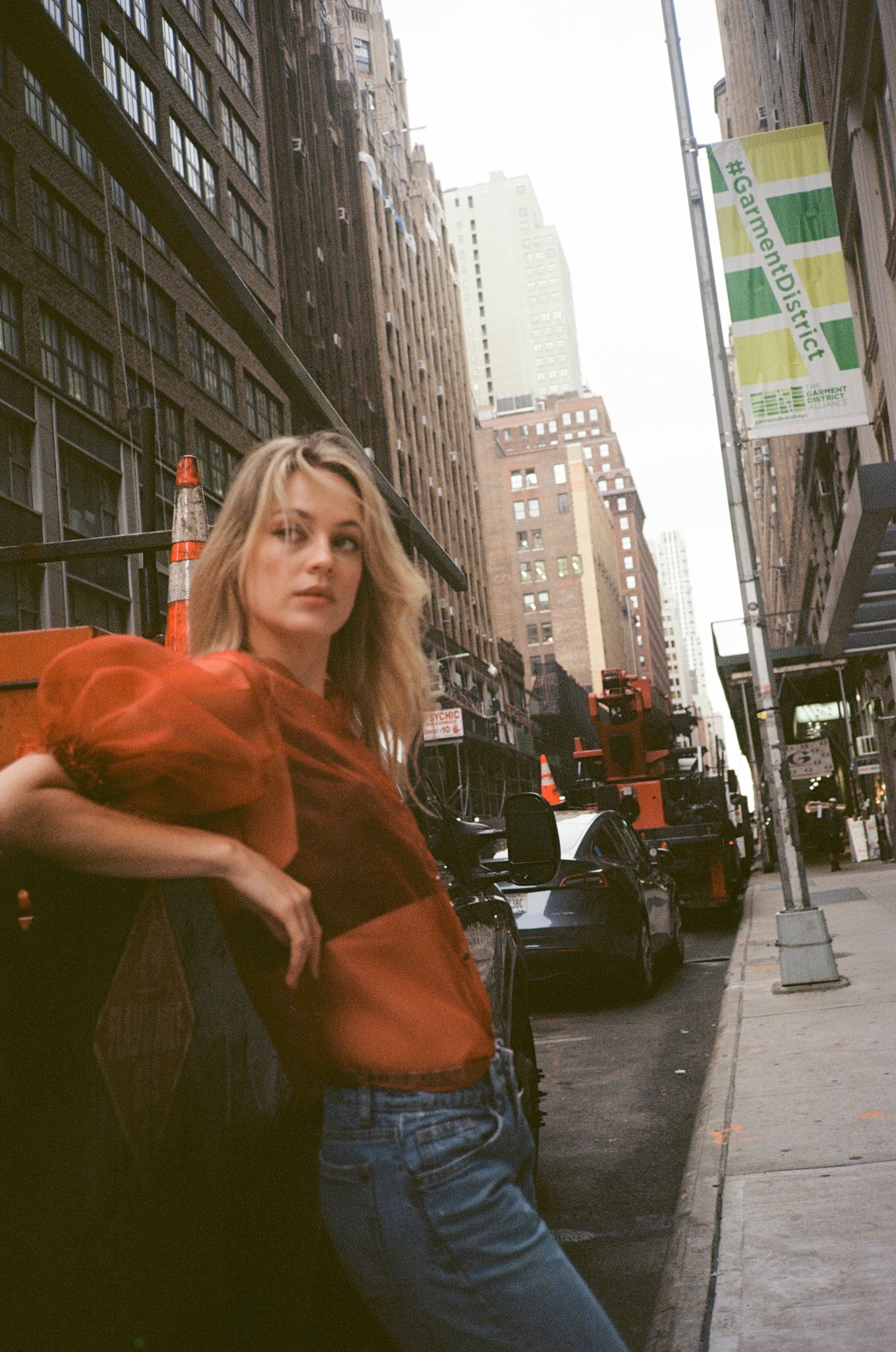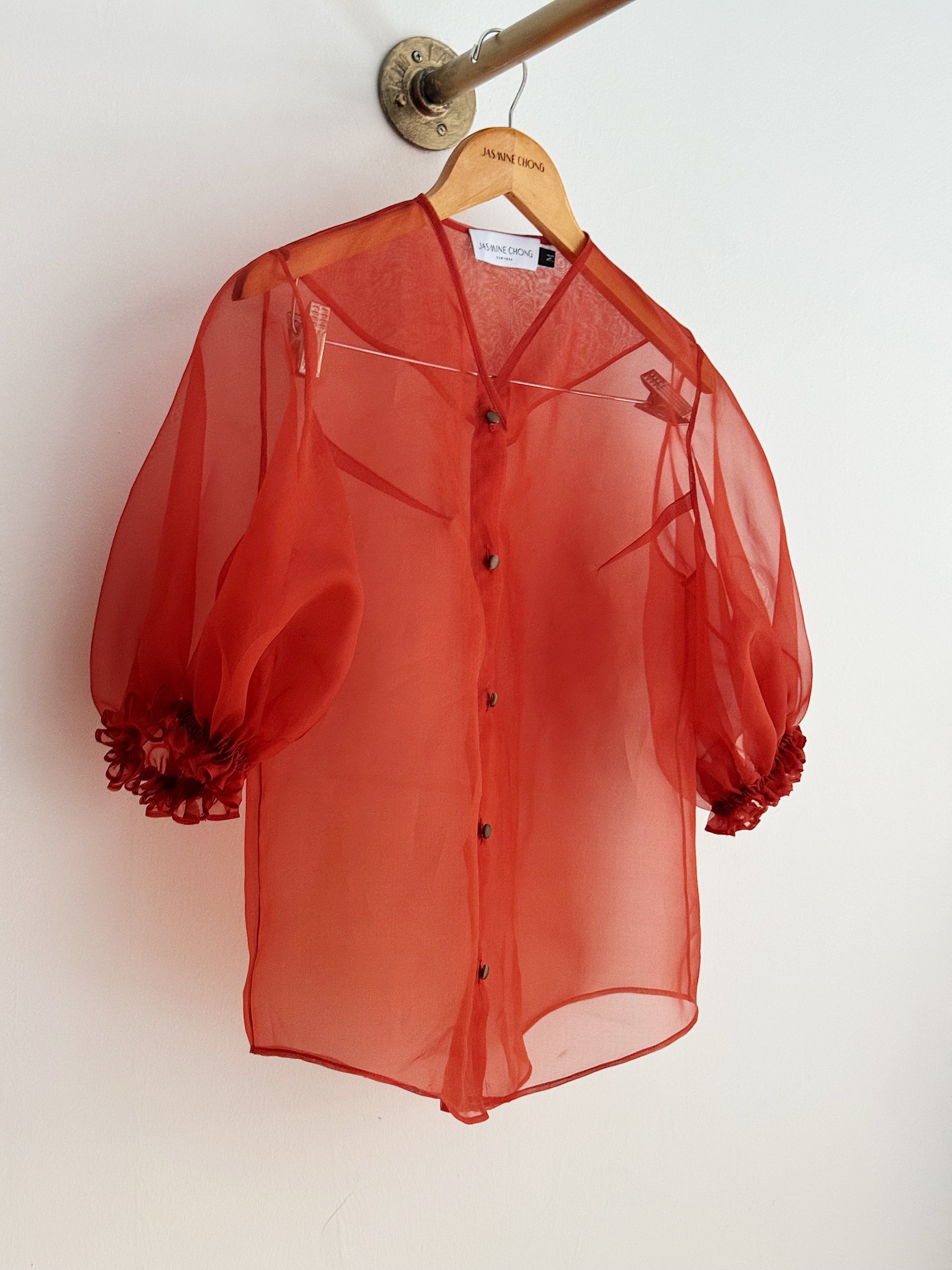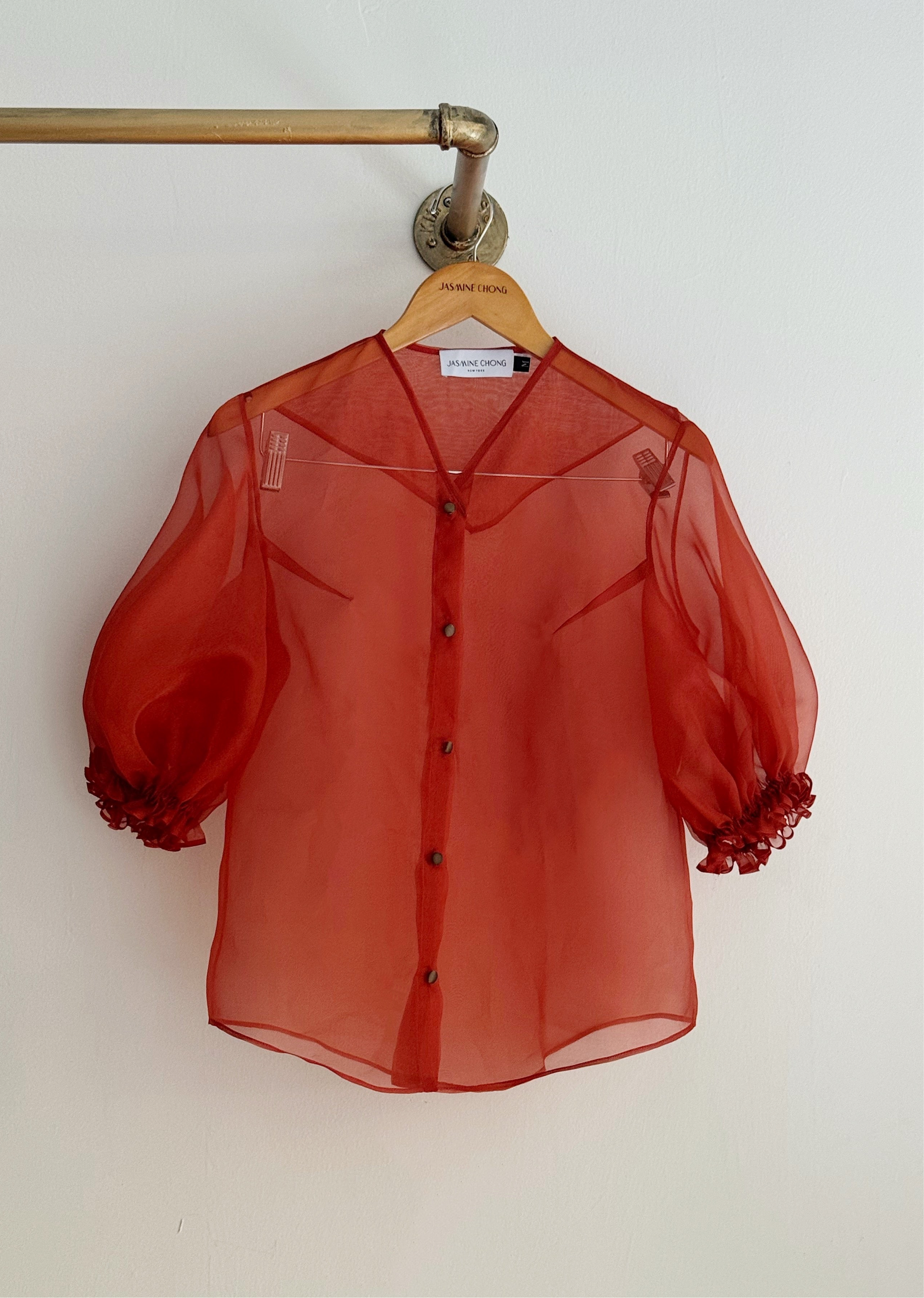 A sheer silk organza button-down shirt with soft structure and subtle volume. Designed with short gathered puff sleeves, and finished with silk-covered buttons down the front. Lightweight and unlined, this piece is meant to be layered, over our Silent Bralette, slips, or over a strapless dress.