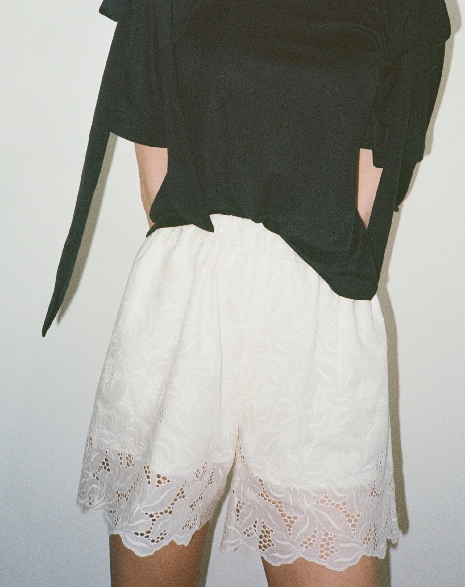 Delicate, but grounded, the Amine shorts are crafted from cotton broderie anglaise, featuring a freesia floral motif. The high-rise silhouette is balanced by an easy elastic waistband, and charming scalloped hems, offering movement and breathability in equal measure. Fully lined, finished with side pockets, the perfect pair of shorts for sunlit days and moonlit wandering.