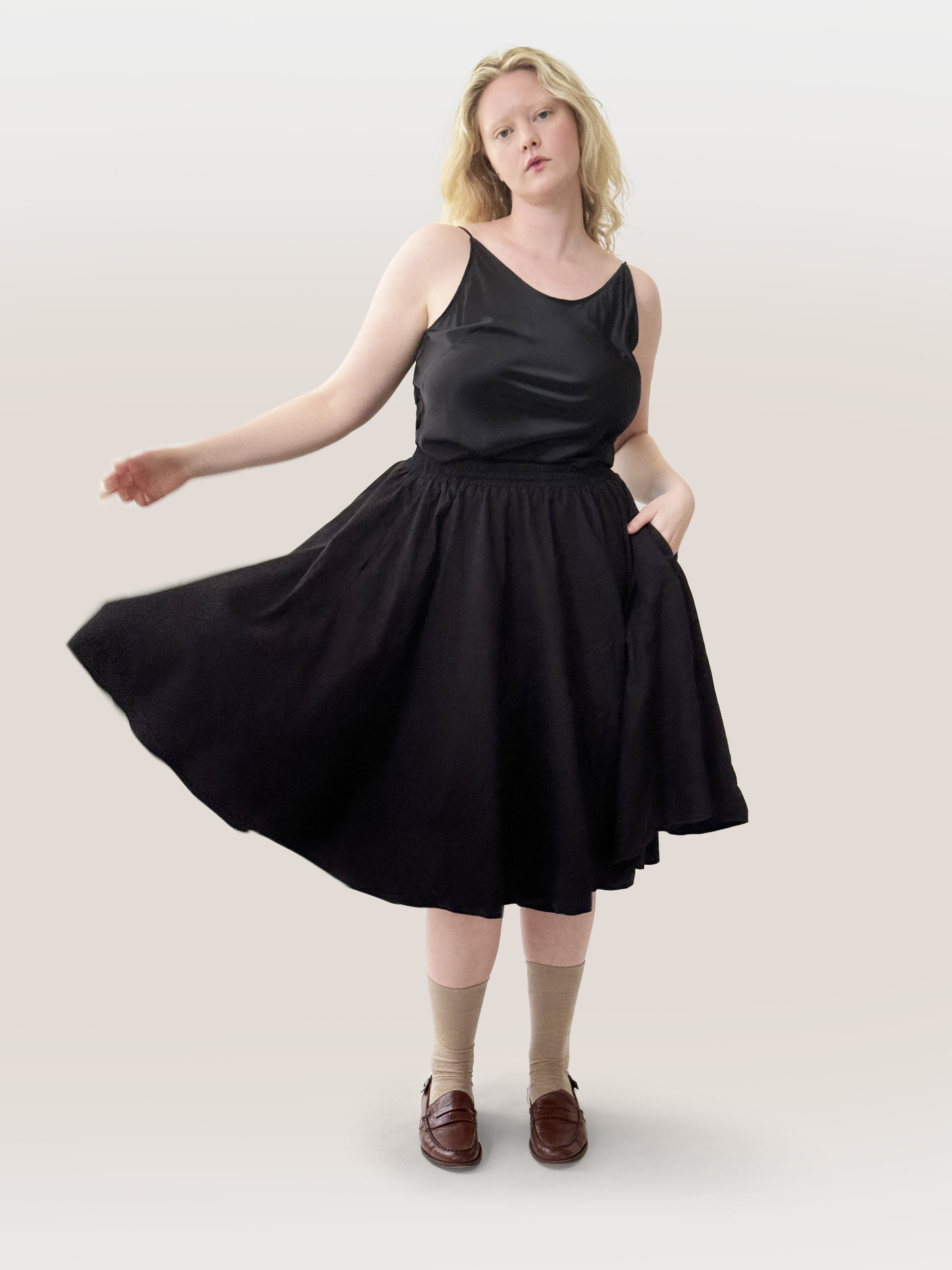 A classic flared skirt reimagined, the Bira Cotton Skirt has opulent organic gathers, creating movement and soft drama. Elastic waist for comfort, flared silhouette, inseam pockets, cut in a medium-weight cotton. Wear with the Taka Bow Drape Tee or a sleek turtleneck for all-season wear.