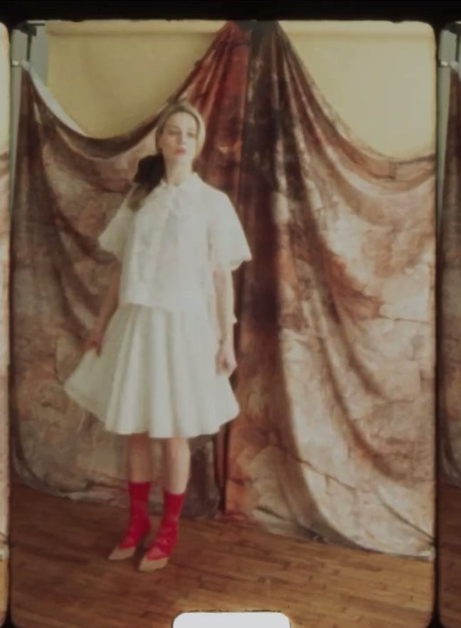 A study in lightness and restraint, the Emily Shirt is crafted from cotton broderie anglaise with a freesia floral motif. A gently flared silhouette skims the wearer, and a scalloped collar lends charm. Designed to be worn alone, or layered over a cami or bathing suit. Mother of pearl buttons.