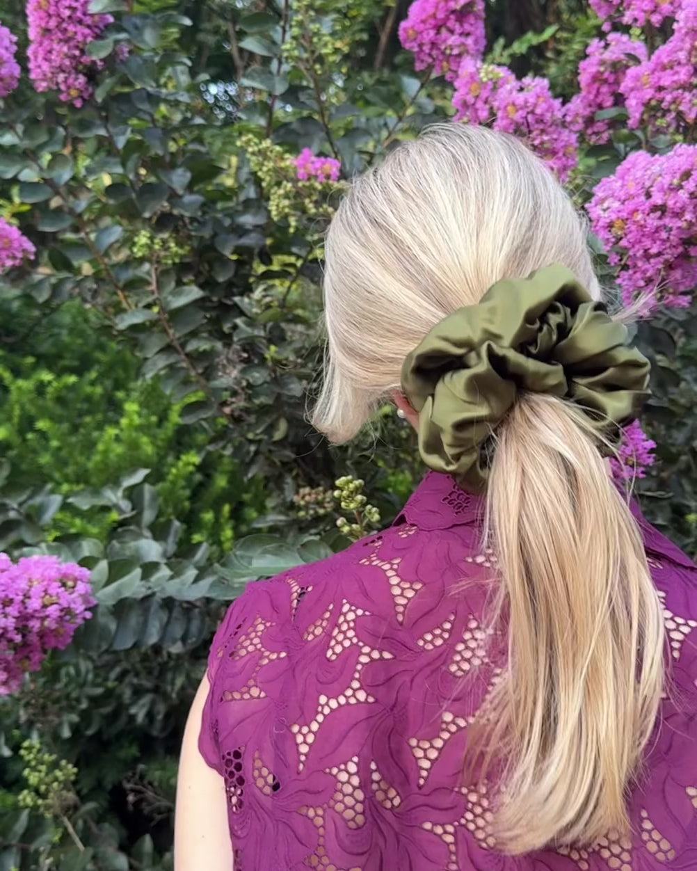 Inspired by the soft folds of the mallow flower and the pillowy indulgence of its namesake confection, the Mallow Scrunchie is a cloud-like gathering of silk. Hand-pleated for sculptural volume, it brings a sense of quiet whimsy and everyday elegance to your hair. Wear in a relaxed low ponytail or perched high in a soft bun, like a buttery petal caught in the wind. Finished with a hand-stitched Jasmine Chong logo.