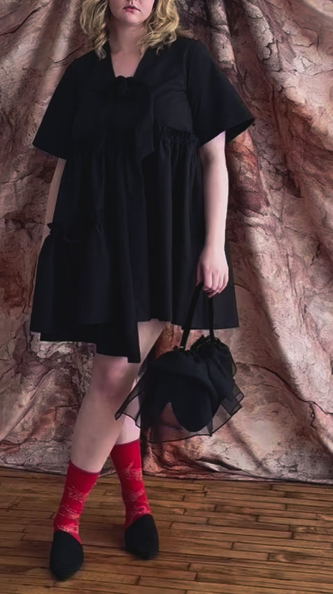A evening bag drawn from shadow. The Nocturna Bag is crafted from black silk velvet and silk organza, its layers gathering and folding like nightfall caught mid-breath. A curved silhouette further softened by sheer volume, it holds its shape yet feels weightless in hand. The exposed zipper is deliberate, a sliver of edge in a quiet disruption. Designed for days and evenings when light retreats and mystery lingers.
