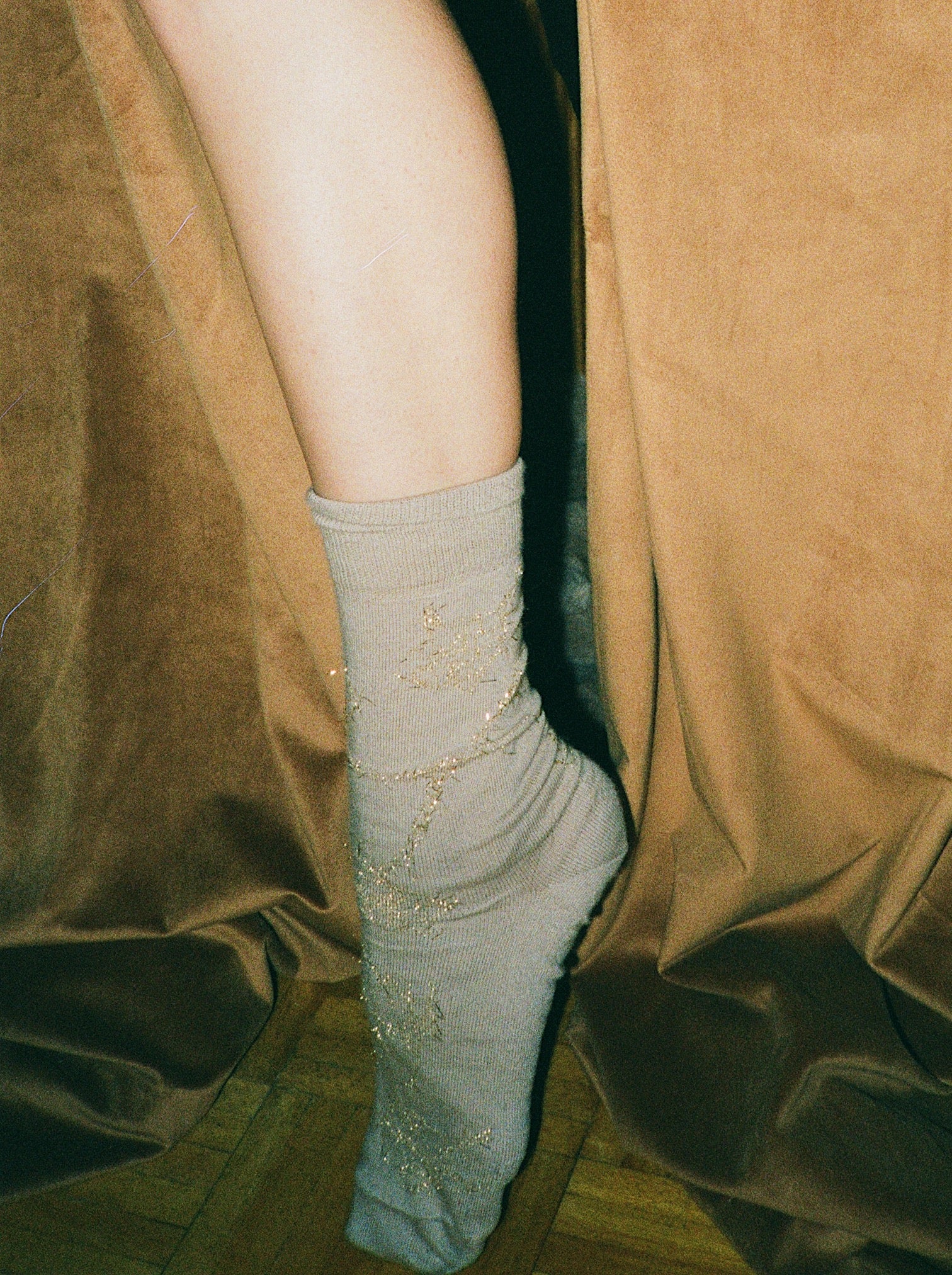 The Rose Gold Sock: A delicate rose garden for your soles, hand-sketched by the designer and woven in soft mercerized cotton and metallic gold thread, predicted to be the subtly shimmery sock of your dreams. Jasmine Chong logo woven on the sole.